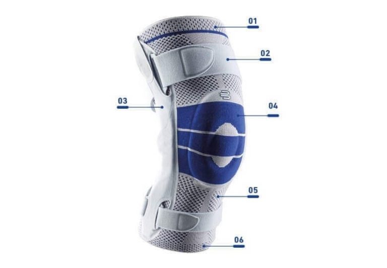 Lateral stays with hinges are the core functional element of the support. They offer passive stabilization as well as active muscular stabilization of the joint thanks to the knitted fabric. This makes it different from conventional knee supports or rigid elements.