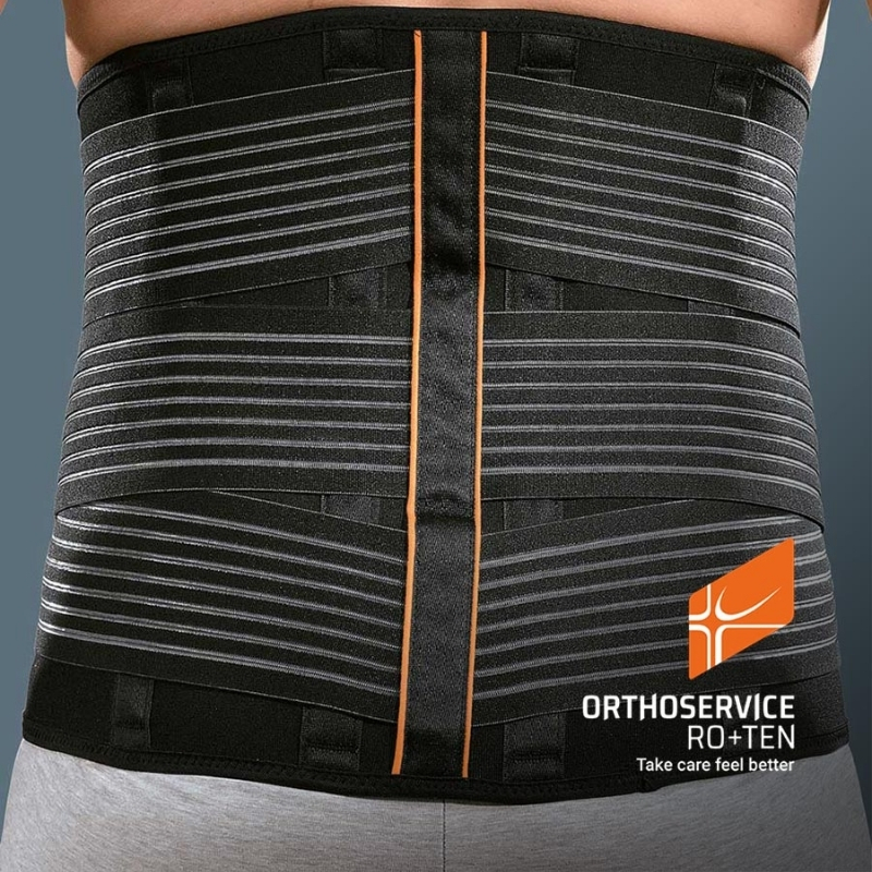 High elastic orthosis with rigid and thermoformable pads to stabilise the lumbar rachis and relieve pressure